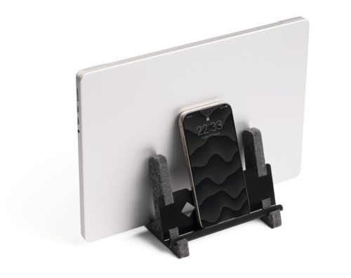 Függőleges állvány 13"-17" laptopokhoz és MacBookokhoz. 60%-ban újrahasznosított PET filcből készült, integrált polccal a tabletek vagy mobiltelefonok számára.