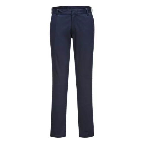 Ez a női slim fit stretch chino a tökéletes választás az uniformizált öltözékhez. Modern, slim fit szabású, dinamikus pamut stretch twill alapanyagból készült. A stretch szövet a legnagyobb kényelmet és mozgásszabadságot biztosítja. Jellemzői közé tartoznak az oldalzsebek, a hátsó gombos zseb és a derékon található kampók és pántos rögzítés. Rendkívül tartós, mindenhol ikeröltésekkel és szegéssel ellátva az összes stresszponton.