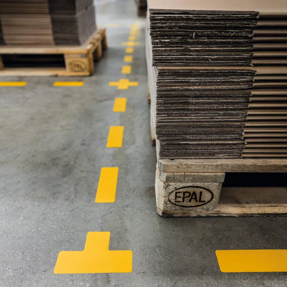 Öntapadó, kereszt alakú padlójelölő alakzat a veszélyes területek, tárolóhelyek, járdák stb. azonosítására