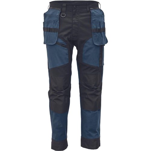 • férfi munkanadrág rugalmas derékkal • 2 oldalsó zseb, két szerszámtartó zsebbel elöl • D-gyűrű • 1 oldalsó zseb a lábon hajtókával • 1 oldalsó zseb cipzárral • 2 hátsó hajtókás zseb • megerősített térdrész, térdvédőtartó • 5 cm-rel meghosszabbítható nadrágszárak • a nadrág hátsó, alsó része megerősített • dekoratív varratok • 265 g/m2
