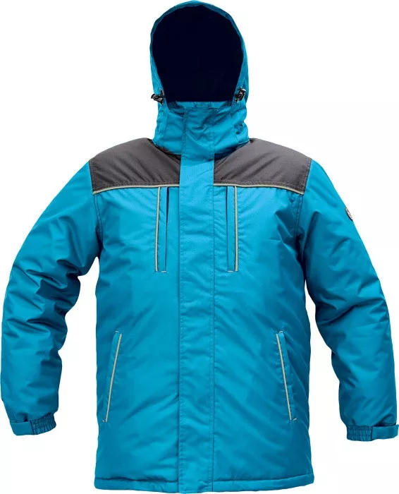 férfi kapucnis télikabát; hosszított hátsórész; 2 mellkasi zipzáras zseb; 2 oldalsó zipzáras zseb; 1 belső zseb tépőzárral; húzózsinór a kabát alján; polár bélésű gallér; a csukló tépőzárral állítható; lecsatolható kapucni